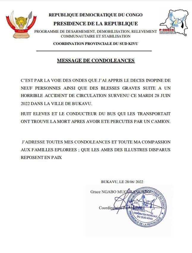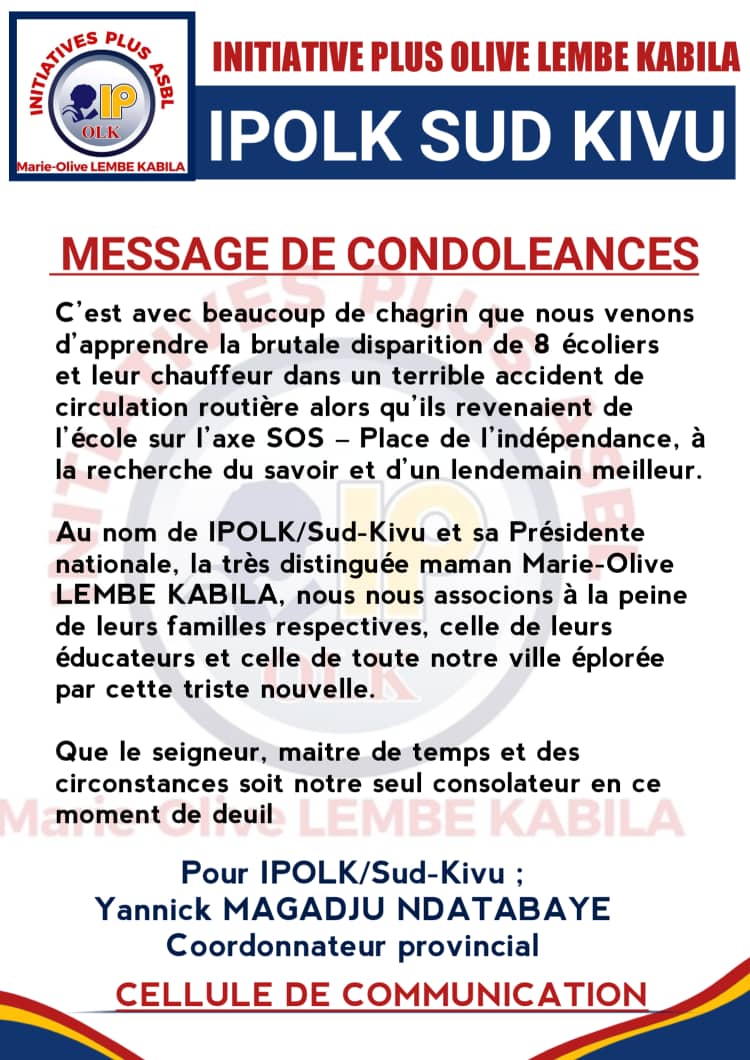 BUKAVU/ SOCIĆTĆ : IPOLK/Sud-Kivu prĆ©sente ses condolĆ©ances aux familles Ć©plorĆ©es par l’accident survenu Ć Kadutu