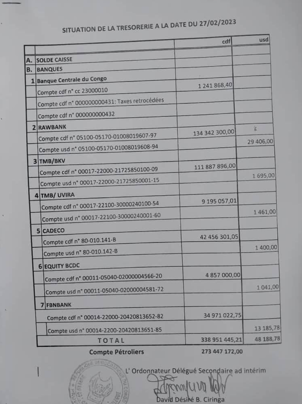 SUD-KIVU/ POLITIQUE : Contrairement aux chiffres avancƩs par Marc Malago, Gouverneur a.i, ThƩo Ngwabidje Kasi a laissƩ dans les caisses de la Province 291.618,03 USD