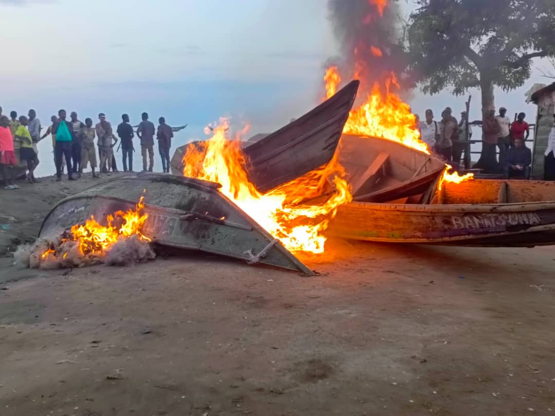NORD-KIVU/ SÉCURITÉ : Incinération des 6 pirogues ainsi que plusieurs filets à maille saisis des mains des pêcheurs illicites sur le lac Edward dans la localité de KYAVINYONGE dans le territoire de Beni