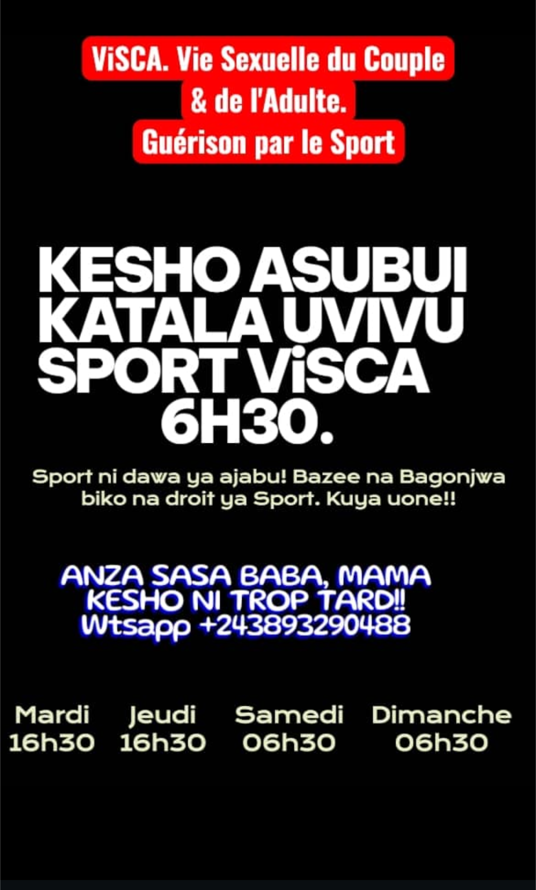 GOMA/ SPORT-SANTE: ViSCA propose un programme qui vise la guĆ©rison par le sport au service de la vie du couple et de lāadulte: Un programme Ć ne pas raterĀ