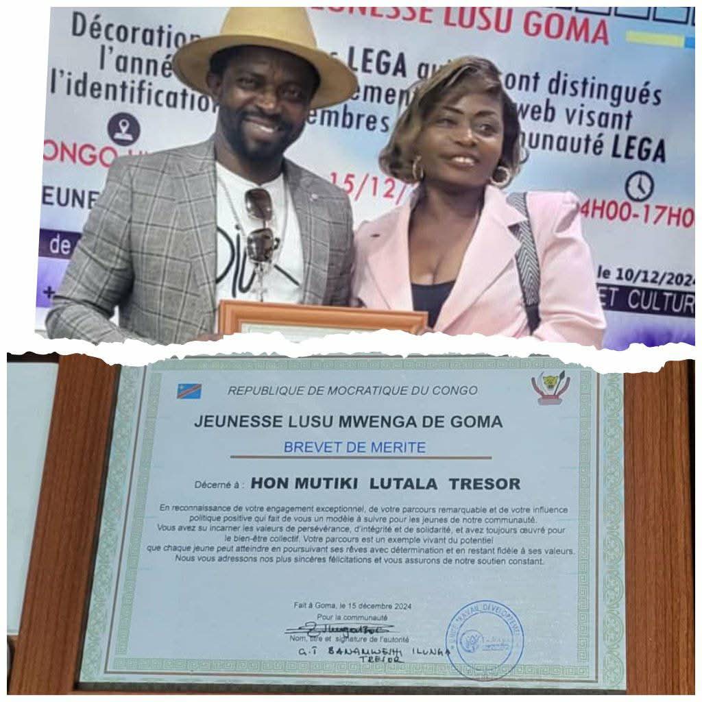 La jeunesse du LUSU LEGA de GOMA a décerné un diplôme de mérite à la FONDATION TRESOR MUTIKI en reconnaissance de l’activité brillante de son PCA, le député national LUTALA MUTIKI Trésor dans la sphère politique du pays actuellement.