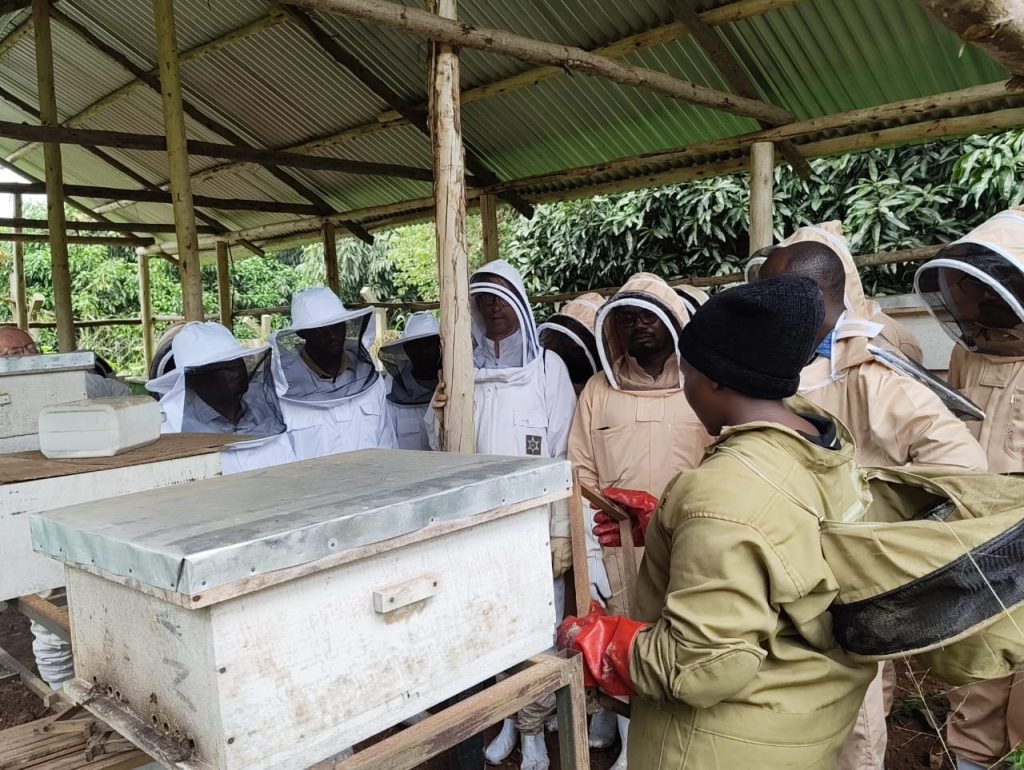 Après quatre jours consacrés à la théorie, les apprenants ont été conduits dans différents ruchers pédagogiques à Kampala pour des travaux pratiques. Ils ont notamment visité le rucher de l’Université de Makerere, où ils ont pu observer et appliquer concrètement les techniques apprises sous la supervision des formateurs.