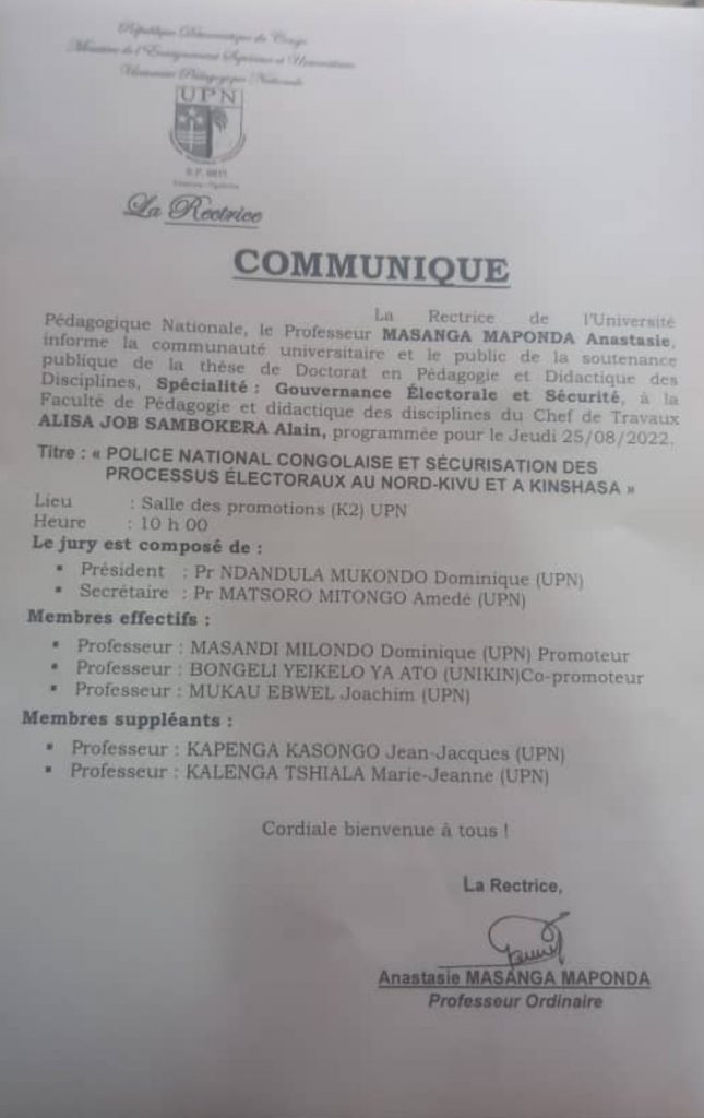 Dans un communiqué dont une copie a été consultée par la rédaction de Masharikirdc.net, la rectrice de l’Université Pédagogique Nationale, le Professeur Masanga Maponda Anastasie, informé la communauté universitaire et le public de la soutenance publique de la thèse de doctorat en pédagogie et didactique des disciplines spécialisées : Gouvernance Électorale et sécurité à la faculté de pédagogie et didactique des disciplines du Chef de travaux Alisa Job Sambokera Alain.