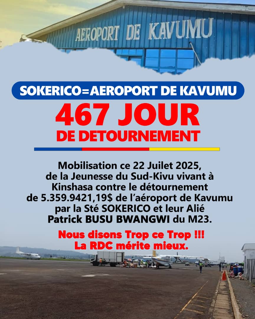 KINSHASA/ SOCIÉTÉ : La Jeunesse du Sud-Kivu vivant à Kinshasa annonce une mobilisation générale le 22 Juillet 2025, pour dénoncer le détournement des fonds destinés à la construction de l’aéroport de Kavumu