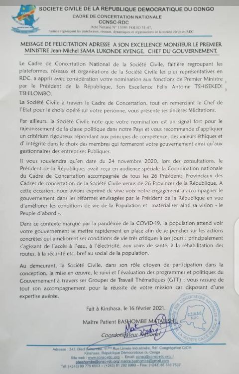Au lendemain de la nomination de Monsieur Sala Lukonde Kyenge par le Chef de l’Etat Felix Tshisekedi comme Premier Ministre de la RDC, les messages de félicitations fusent de partout, c’est le cas de celui de Maître Patient Bashombe, Coordonnateur du Cadre de Concertation National de la Société Civile (CCNSC).