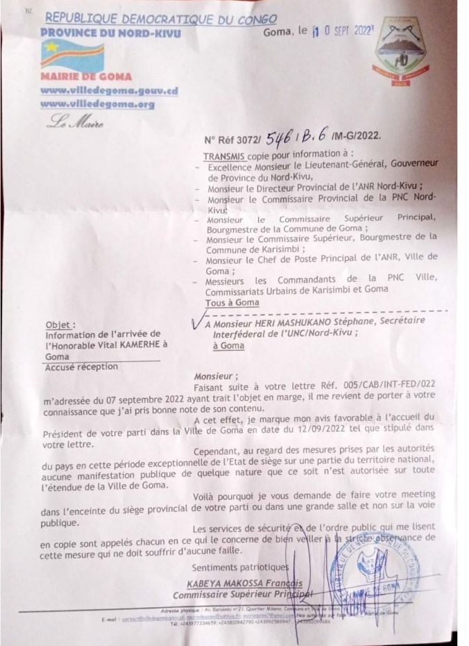 Notons par ailleurs que le Maire de Goma dans cette même correspondance, marque son avis favorable pour l’accueil du Président national de l’UNC qui atterrira rappelons-le à l’aéroport international de Goma, le lundi 12 Septembre 2022.