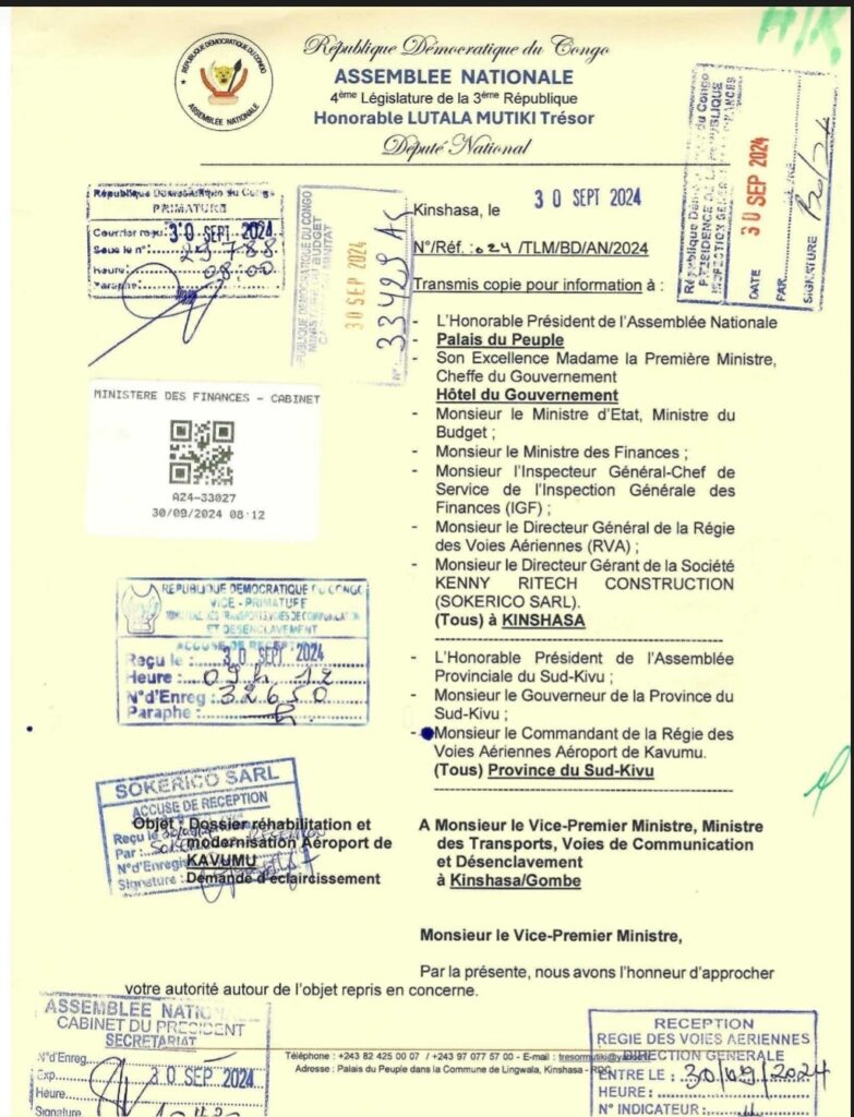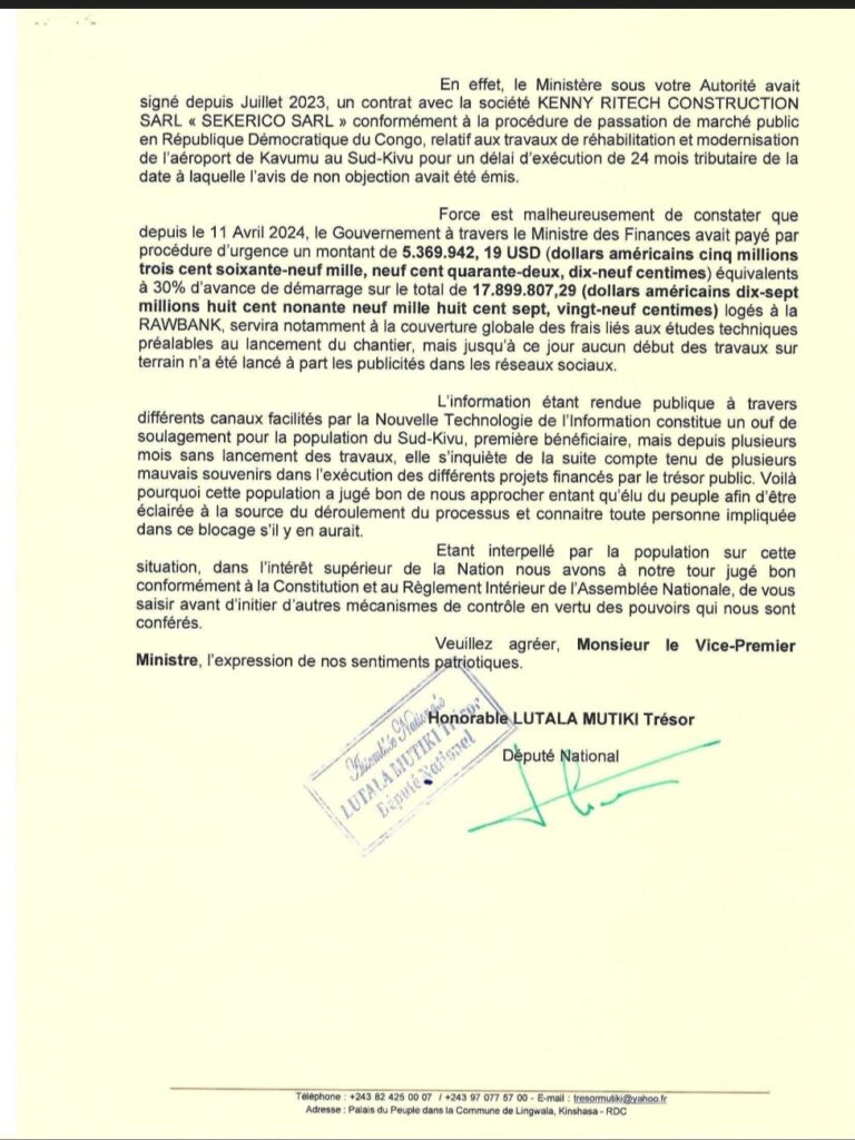 En effet, dans cette correspondance, le député national fait savoir que le Ministère des transports, voies de communications et Désenclavement avait signé depuis Juillet 2023, un contrat avec la société KENNY RITECH CONSTRUCTION SARL « SEKERICO SARL » conformément à la procédure de passation de marché public en République Démocratique du Congo, relatif aux travaux de réhabilitation et modernisation de l’aéroport de Kavumu au Sud-Kivu pour un délai d’exécution de 24 mois à partir de la date à laquelle l’avis de non objection avait été émis.