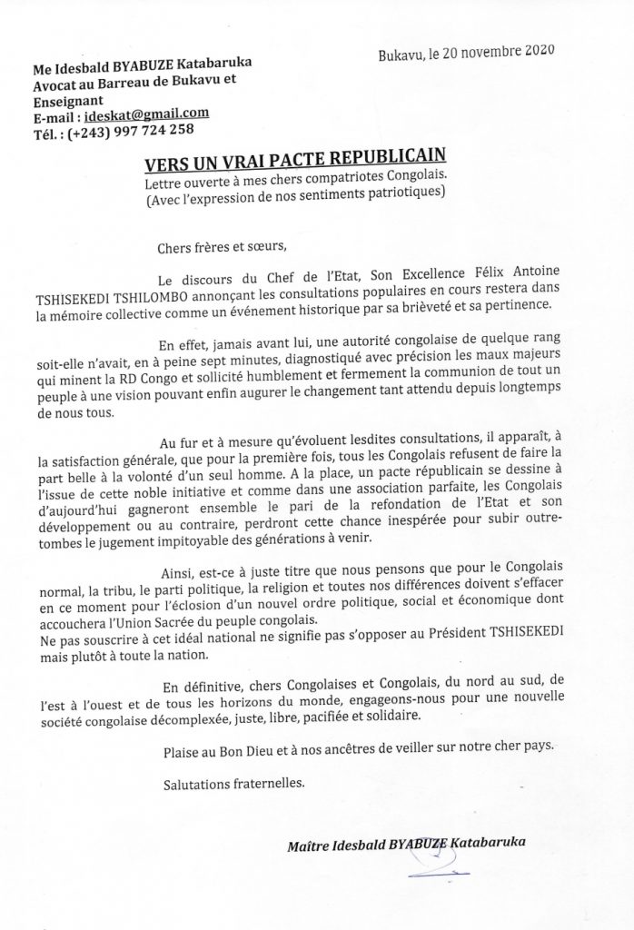 En définitive, pour Maître Idesbald Byabuze Katabaruka, tous les Congolaises et Congolais, du nord au sud, de l’est à l’ouest et de tous les horizons du monde, doivent s’engager pour une nouvelle société congolaise décomplexée, juste, libre, pacifiée et solidaire.