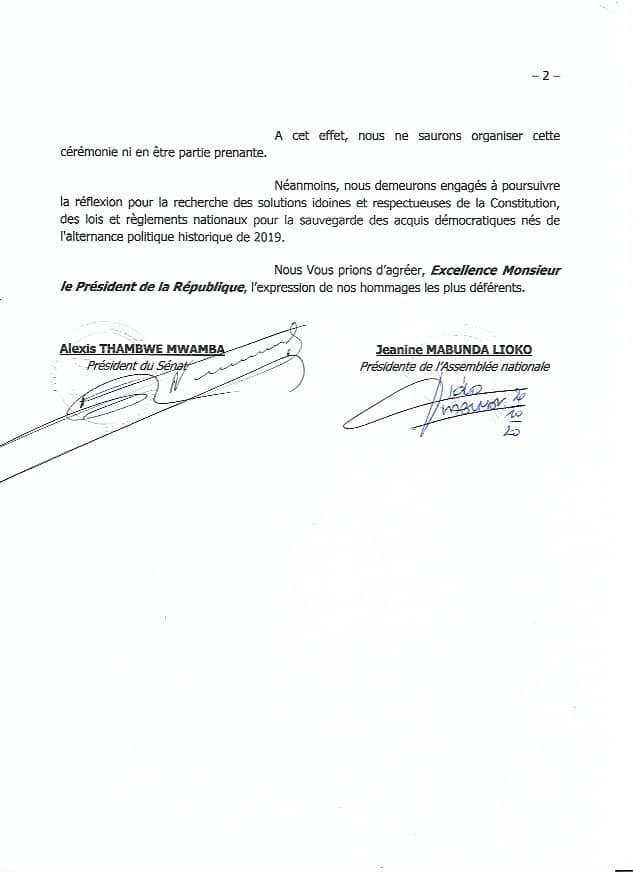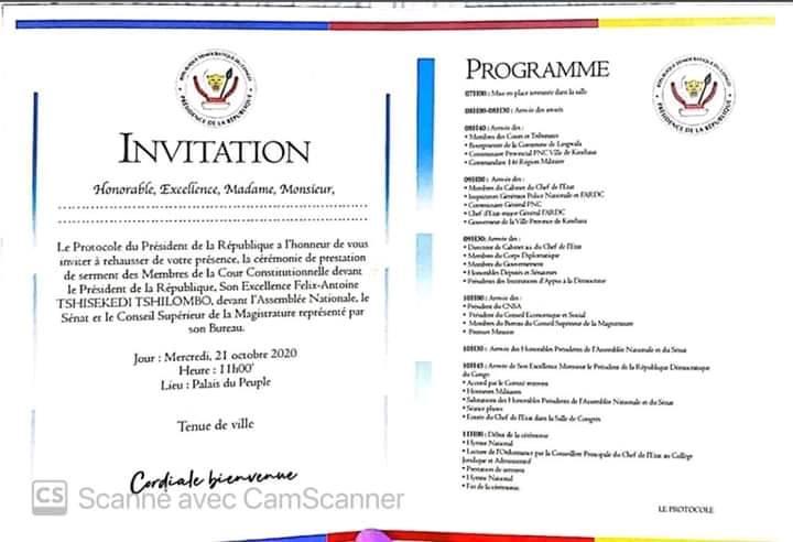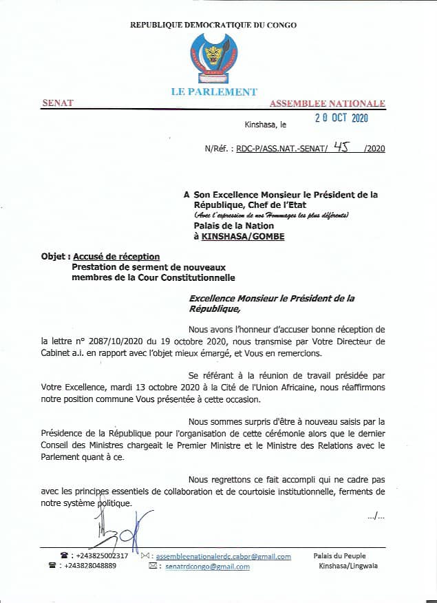 Alors que le Protocole dāEtat National vient lancer les invitations conviant Ć la cĆ©rĆ©monie de prestation de serment des Juges Membres de la Cours Constitutionnelle devant le PrĆ©sident de la RĆ©publique, lāAssemblĆ©e National, le Senat et le Conseil de la Magistrature reprĆ©sentĆ© par son bureau ce Mercredi 21 Octobre 2020, Alexis Thambwe Mwamba et Jeanine Mabunda respectivement PrĆ©sident du Senat et PrĆ©sidente de lāAssemblĆ©e Nationale viennent dāĆ©crire au PrĆ©sident de la RĆ©publique pour dĆ©cliner lāorganisation et leur participation Ć cette cĆ©rĆ©monie.