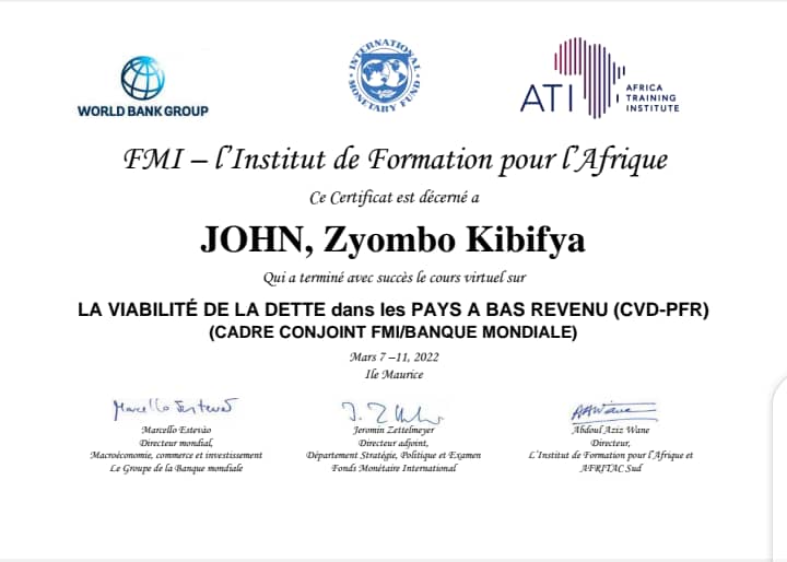 John Zyombo vient de participer à la formation du FMI-BANQUE MONDIALE sur le cadre de la viabilité de la dette pour les pays à faible revenu. A l’issue de cette formation, il a reçu un certificat attestant la formation reçue.