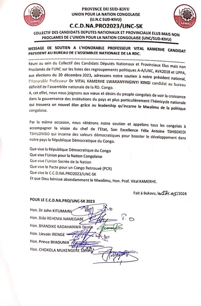 En effet, le collectif des candidats députés nationaux et provinciaux élus mais non proclamés de l’Union pour la Nation Congolaise aux élections du 20 décembre 2023 apportent leur soutien à la candidature unique de l’union sacrée de la nation en la personne du Mwalimu le professeur Dr, l’honorable Vital Kamerhe!