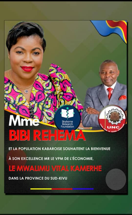 Très visibles sur tout le parcours de l’aéroport, jusqu’au centre-ville, les membres de Skybone Research Foundation arboraient des banderoles frappés des effigies de l’honorable Vital Kamerhe, Vice-premier Ministre, Ministre de l’économie nationale et de Vital Muhini, Deuxième Vice-président de l’Assemblée nationale encadrant Madame Biibi Rehema Namegabe, Coordonnatrice de Skyborne Research Foundation et candidate député Provinciale du parti politique UNC de Vital Kamerhe.
