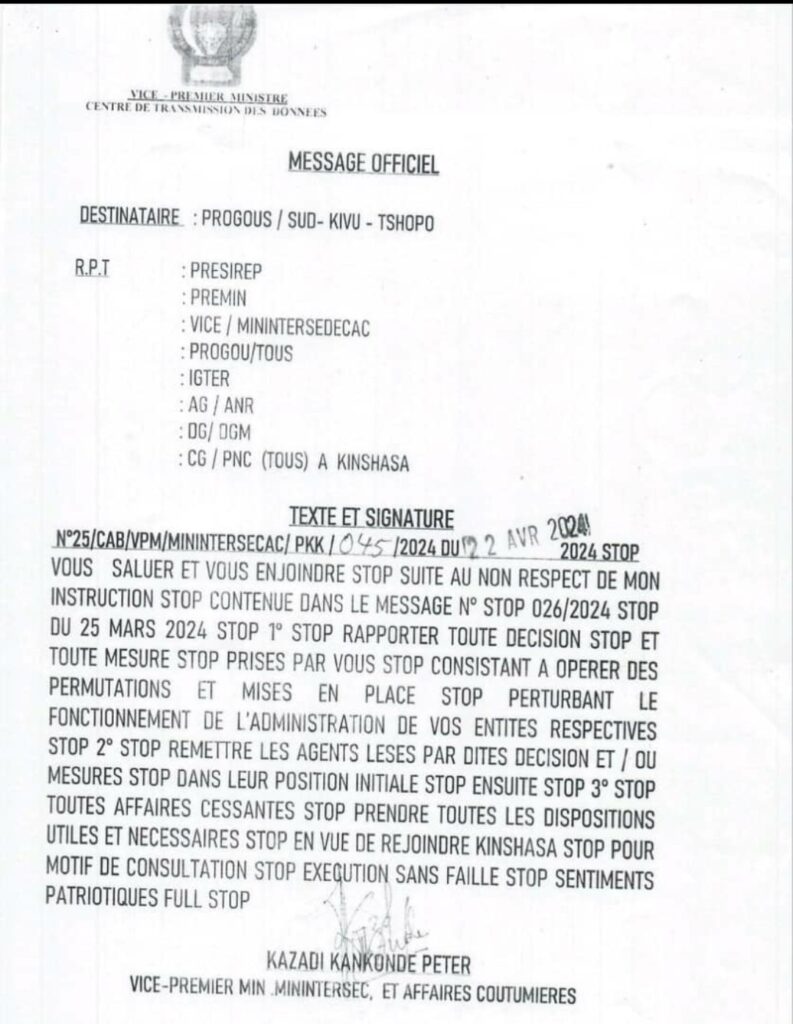 Dans le message télégramme N°25/CAB/VPM/MININTERSECAC/ PKK/045/ 2024 dU 2 Avril 2024, dont copie a été consultée par notre rédaction, Monsieur Marc Malago, Gouverneur intérimaire du Sud-Kivu est rappelé toute affaire cassante à Kinshasa pour consultation par Vice-Premier Ministre, Ministre de l’intérieur
