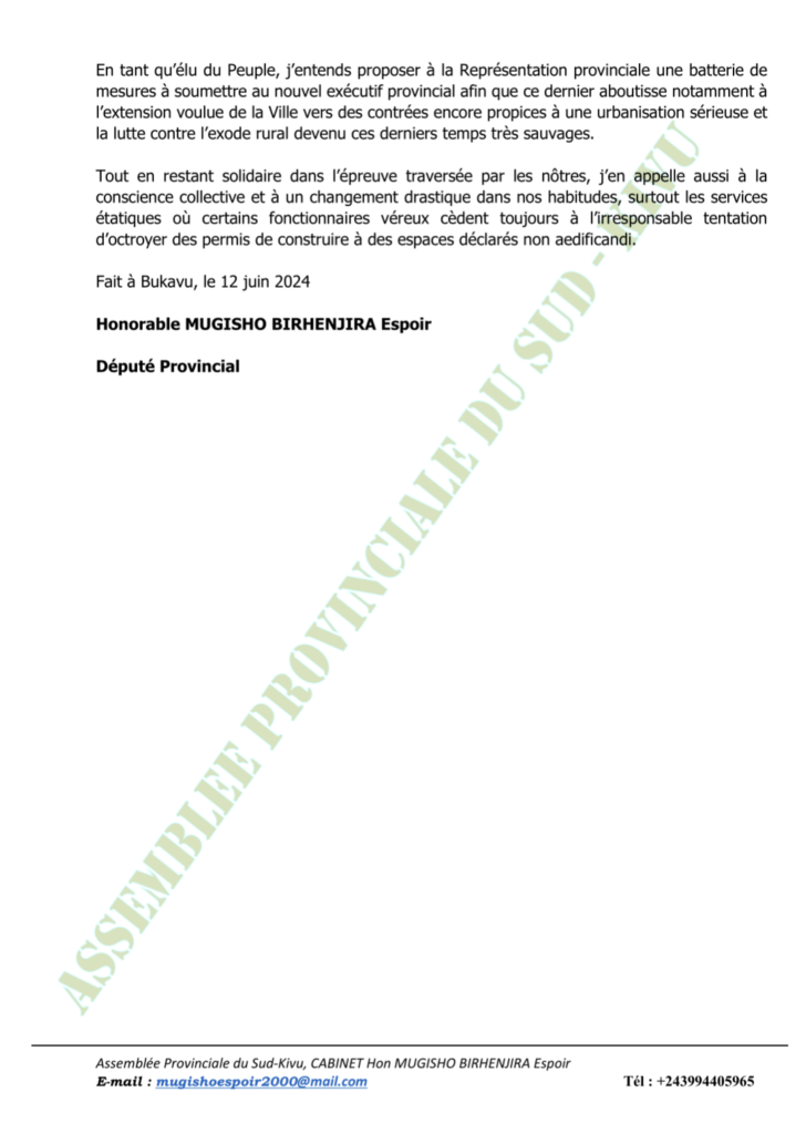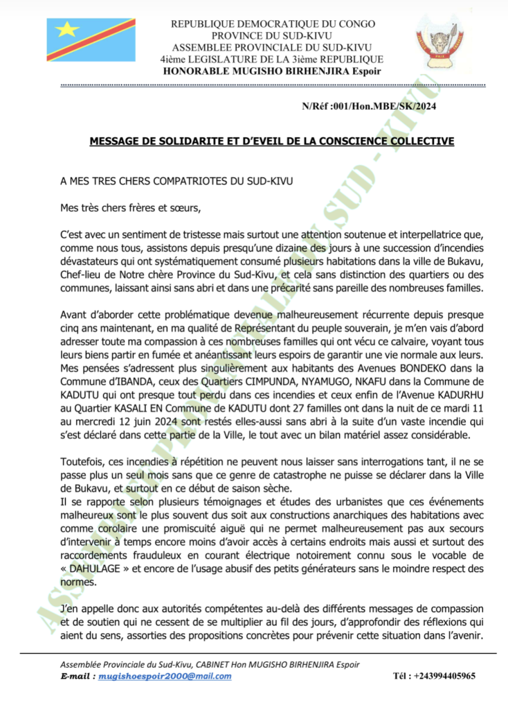 SUD-KIVU/ SOCIÉTÉ : Face à la récurrence des cas d’incendies dans la Ville de Bukavu, l’Honorable Député Provincial Espoir Mugisho BIRHENJIRA témoigne sa solidarité et appelle à l’éveil de la conscience collective